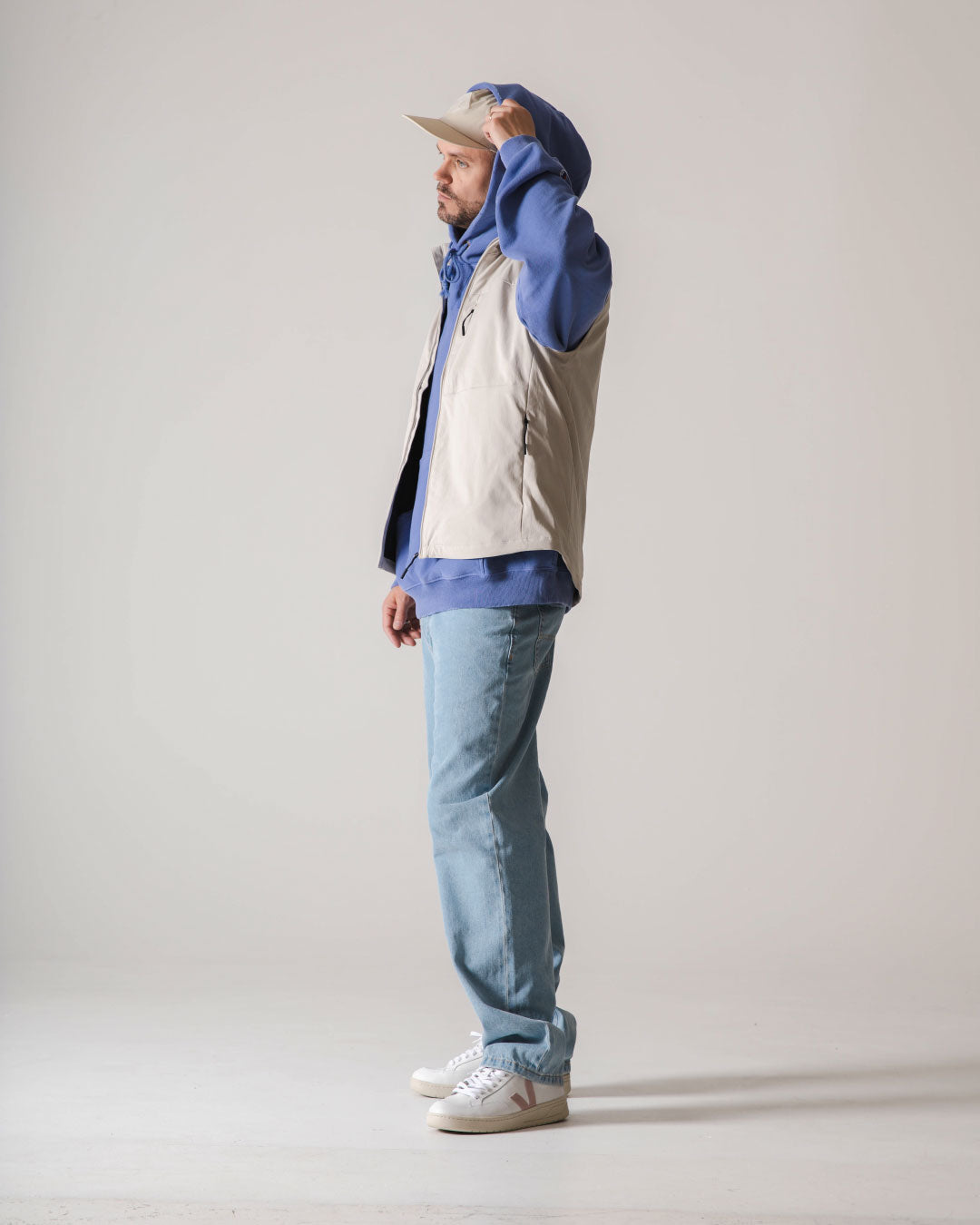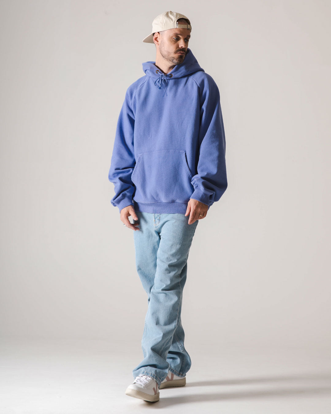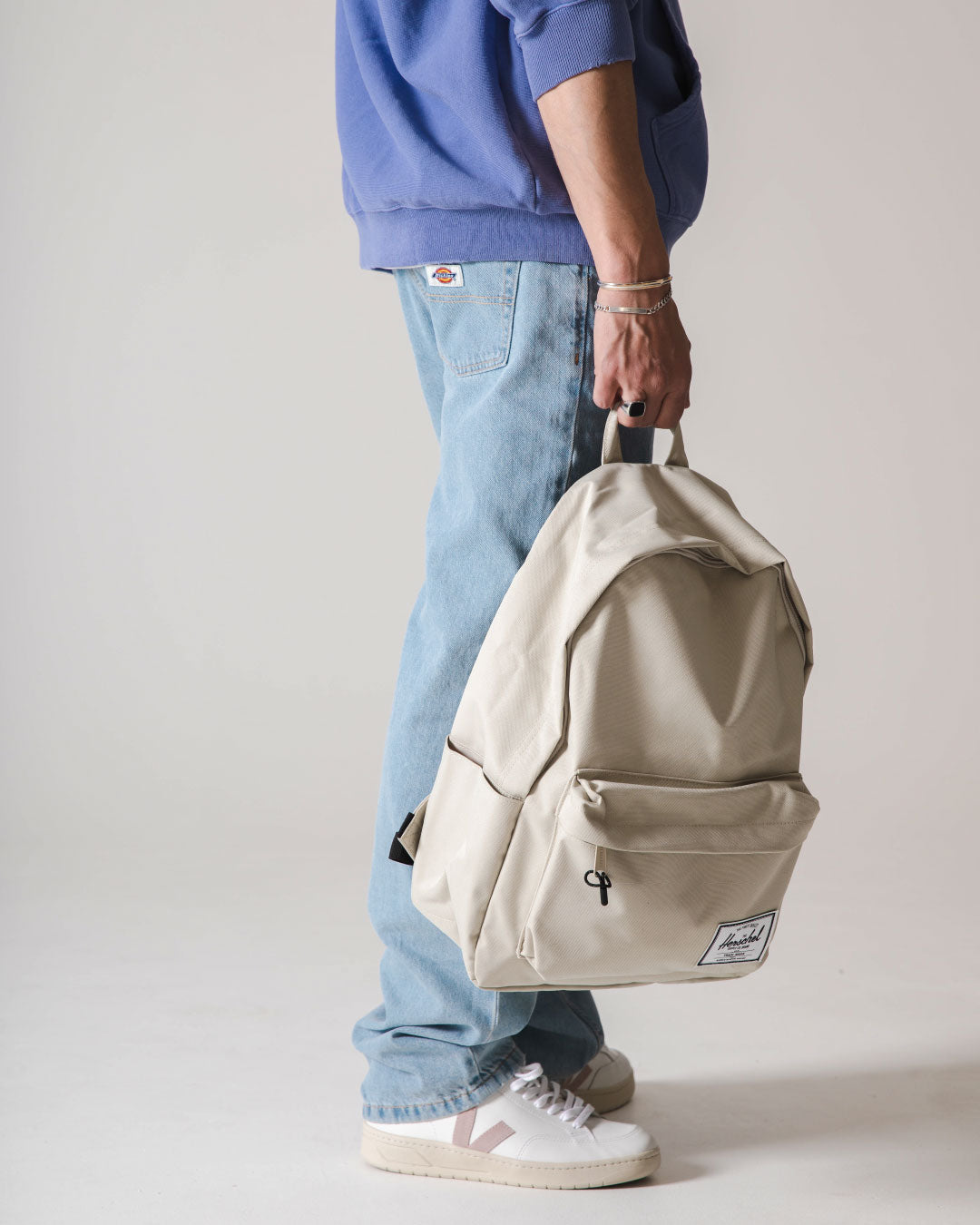 Als nächstes kommt ein Denim/Lavendel-Look von CHAMPION und DICKIES. Champion ist und bleibt ein Experte für Hoodies, hier haben wir eine gebleichte Denim-Farbe, die perfekt zu ein paar Vintage-Jeans von Dickies passt! Mütze und Tasche von HERSCHEL in der Farbe Light Pelican, passend zur Weste von NORSE PROJECTS und VEJA V-12