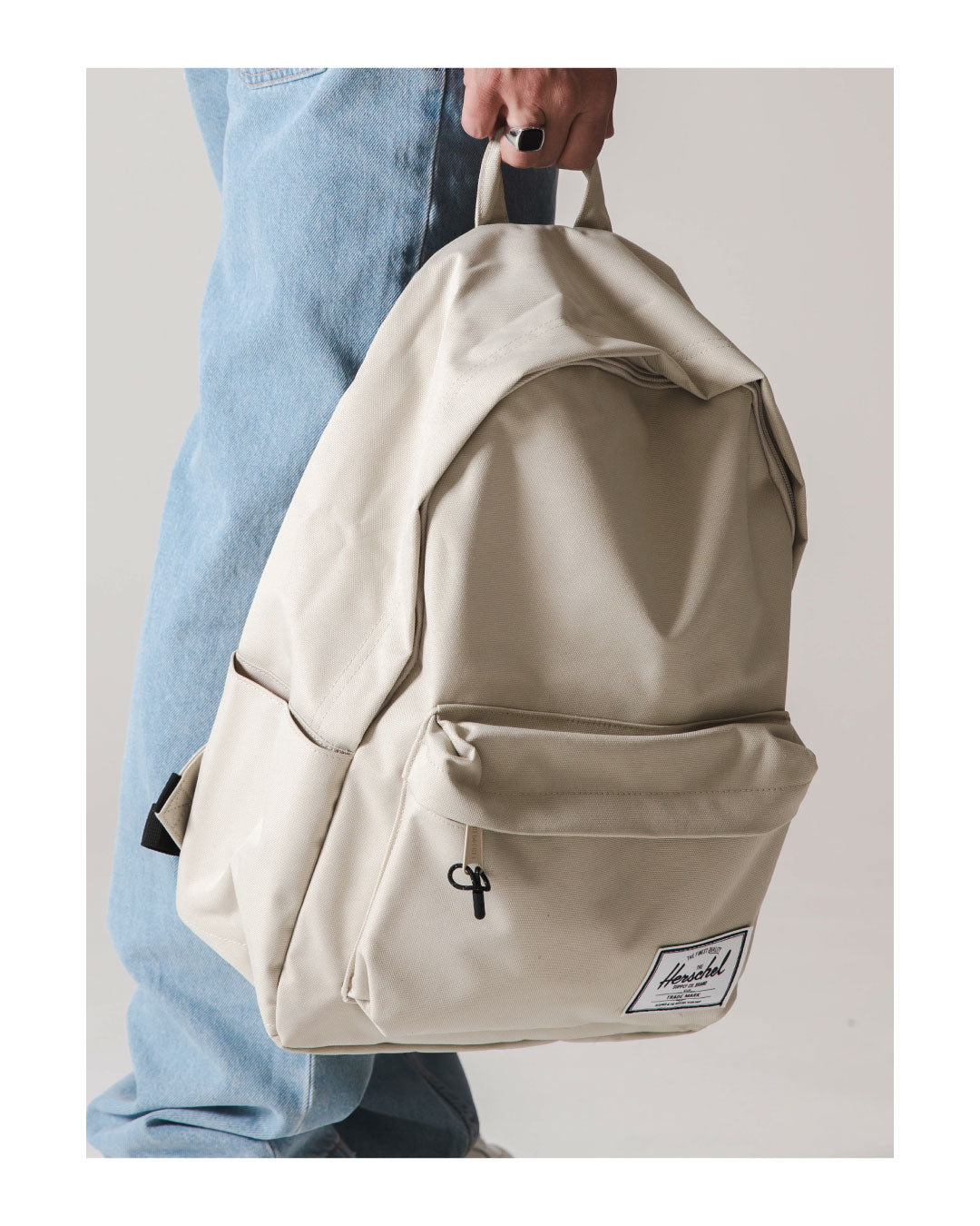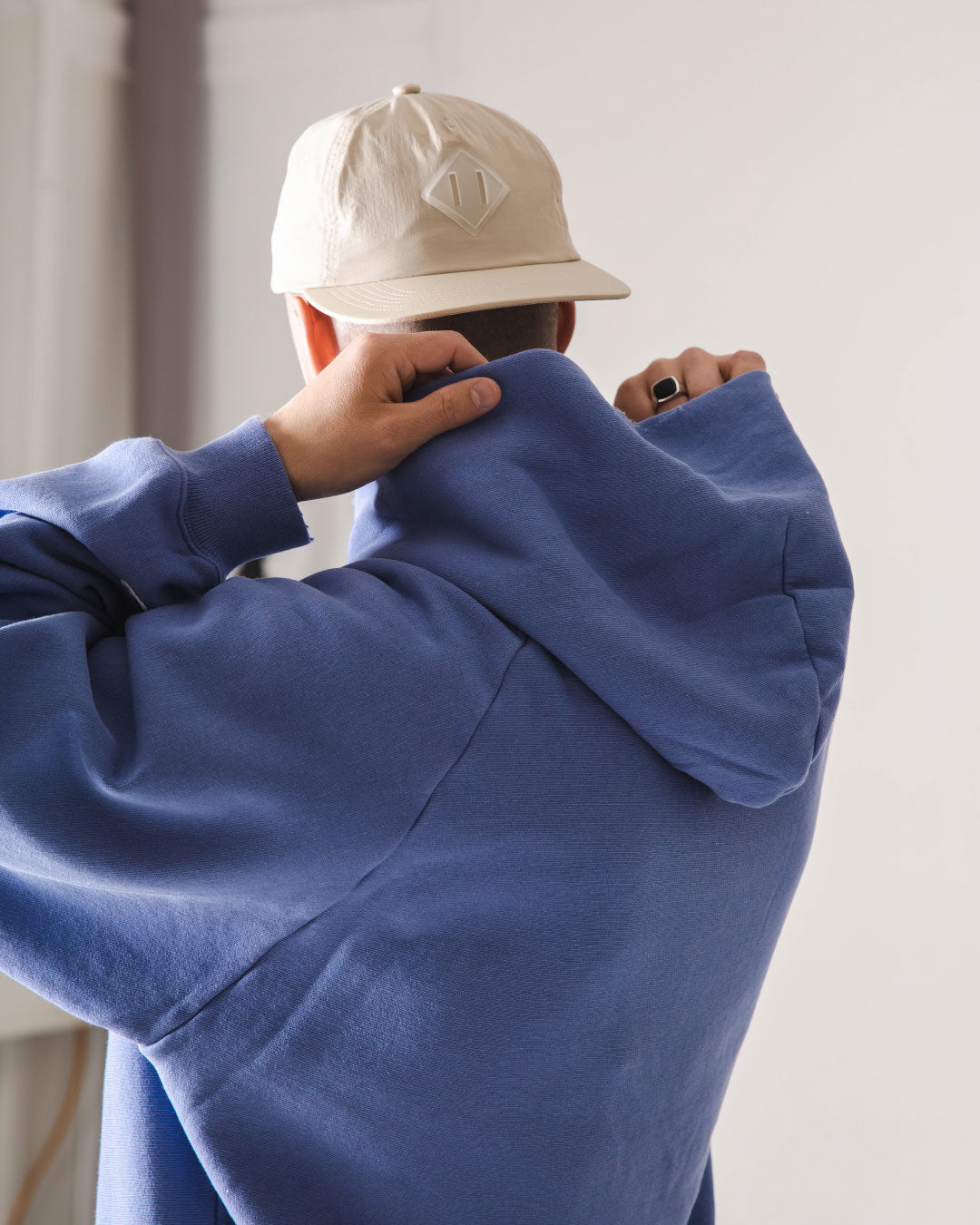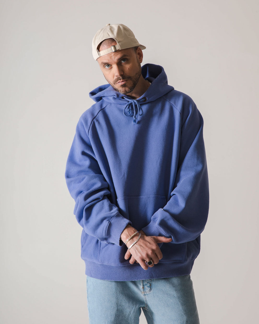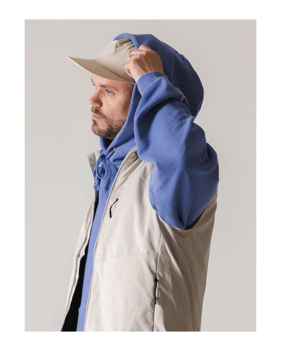 Als nächstes kommt ein Denim/Lavendel-Look von CHAMPION und DICKIES. Champion ist und bleibt ein Experte für Hoodies, hier haben wir eine gebleichte Denim-Farbe, die perfekt zu ein paar Vintage-Jeans von Dickies passt! Mütze und Tasche von HERSCHEL in der Farbe Light Pelican, passend zur Weste von NORSE PROJECTS und VEJA V-12