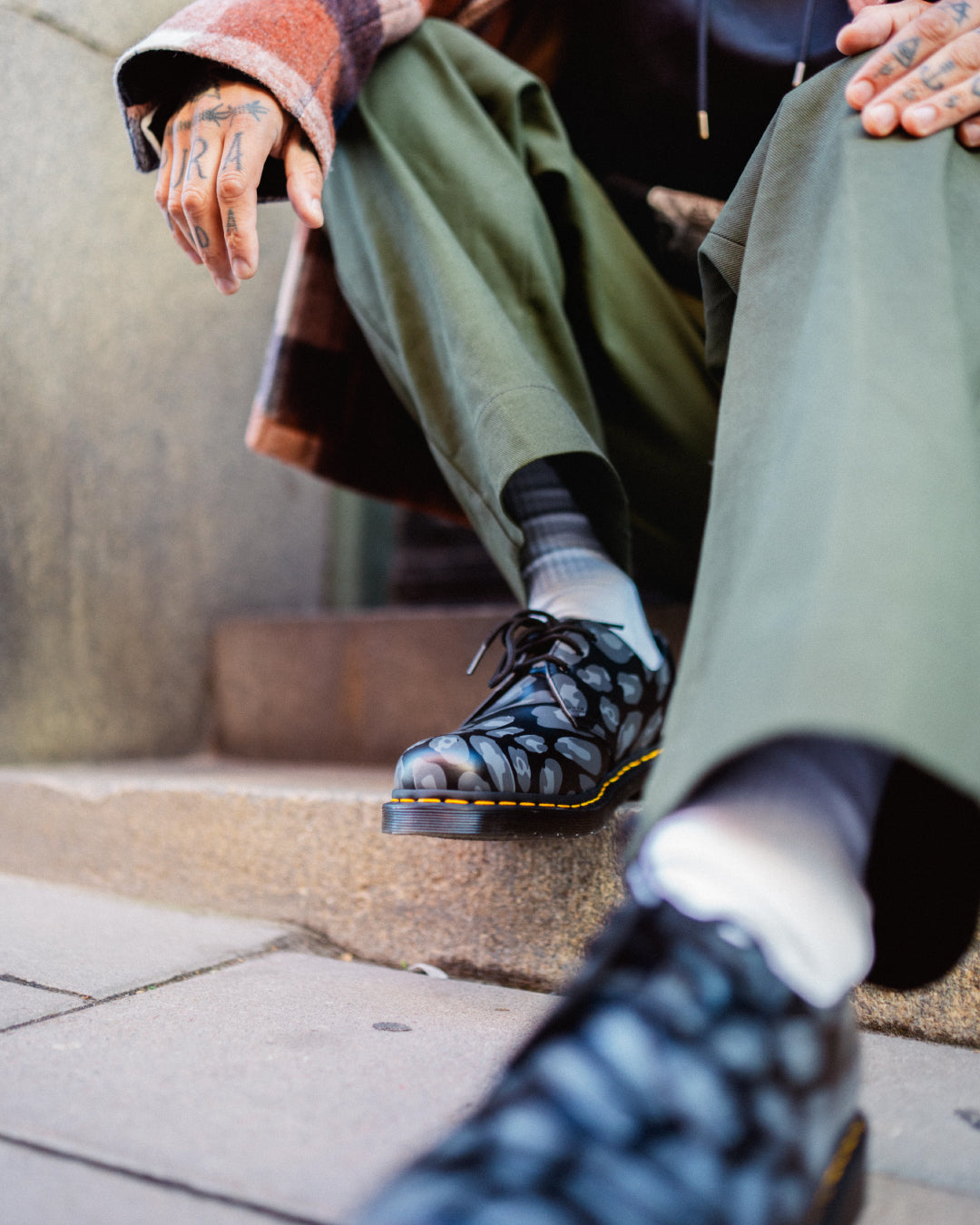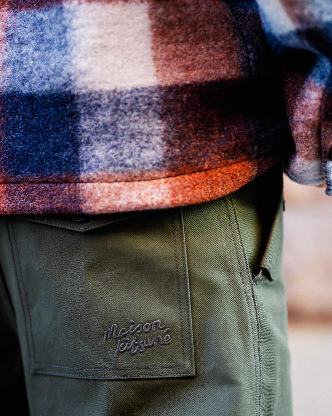 Of course we had to go with the MAISON KITSUNÉ Workwear Pants in Millitary Green, a baggy cotton twill workwear pant with a handwritten “Maison Kitsuné” embroidered on the back pocket and the DR MARTENS 1461 in grey and black leopard pattern.