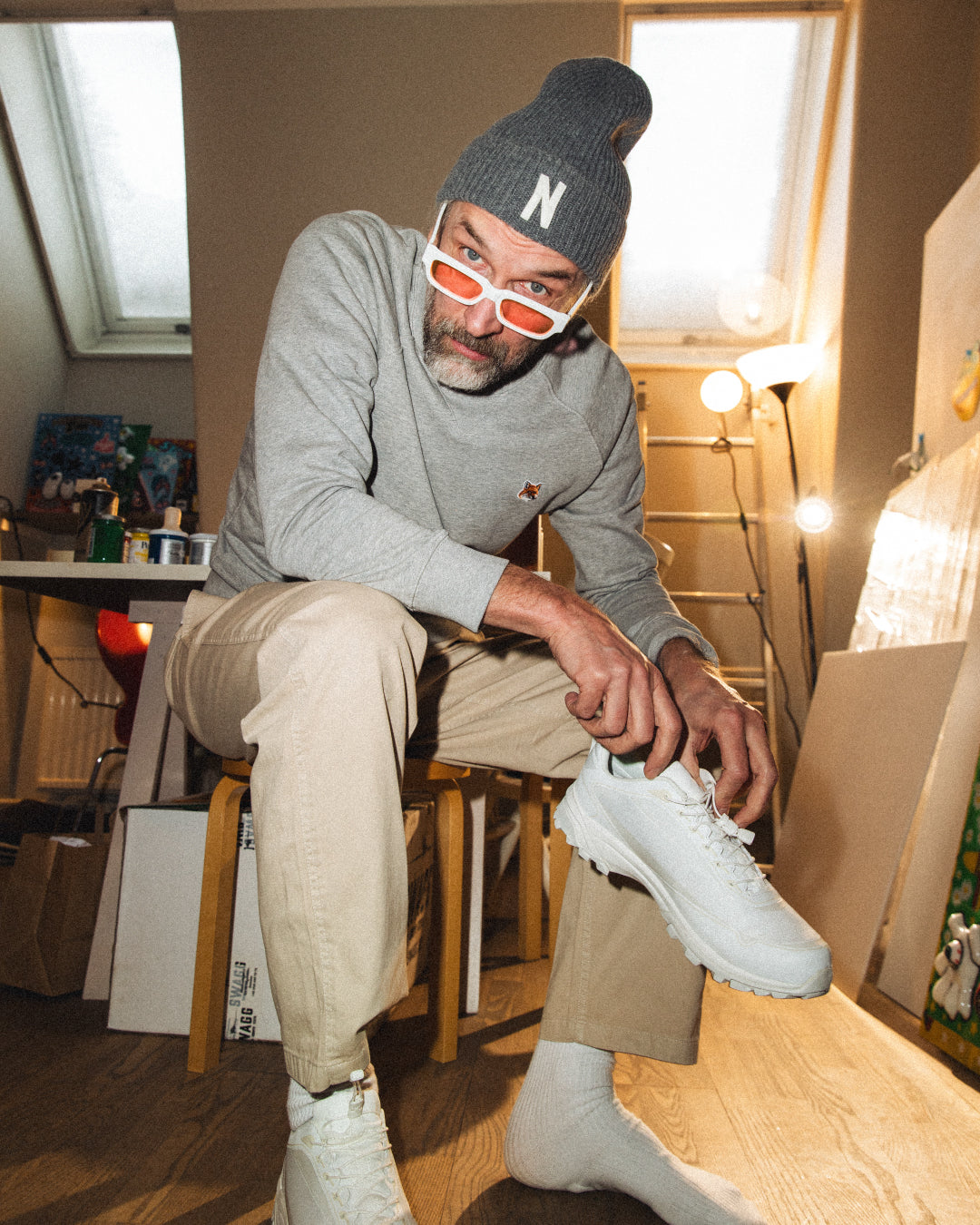 Pour combattre le froid persistant, nous avons ajouté un bonnet en laine d'agneau Norse Projects et des chaussures à lacets V02 de Norse Projects Arktisk pour la stabilité et la protection imperméable.